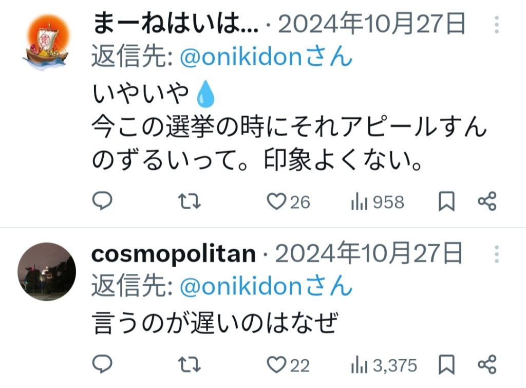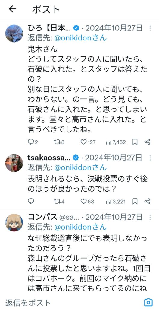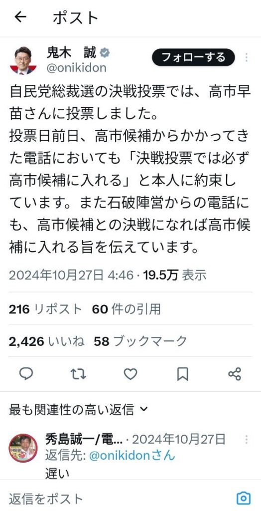 どういう事かというと、鬼木氏は決選投票で高市氏に投票していたのに、石破氏が自民党総裁に決定したので、石破氏に反対勢力だと思われないように黙っていたんです。しかし、自分が選挙区で落選しそうなので衆議院選挙当日の朝5時頃、X(twitter)で突然、「決選投票は高市氏に投票しました」とポストしたんです。